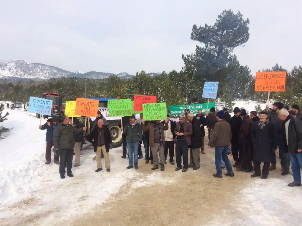 Bölge halkı taşıdıkları pankartlarda, "Çimento fabrikasına hayır', 'Doğal yaşamı savunuyoruz', 'Yeşilimizi, meyvemizi, havamızı koruyoruz', 'Çimento mu yiyek', 'Havama toprağıma suyuma dokunma', 'Uzun lafa gerek yok istemiyoruz', 'Ciğerlerimize beton dökmeyin' yazıyor.