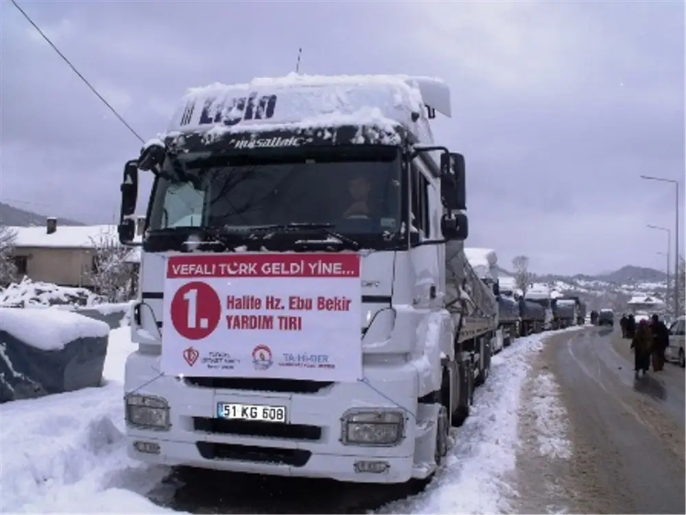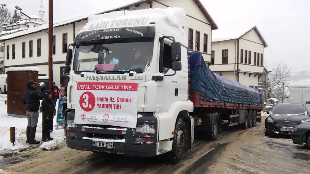 Kampanyanın tanıtımında kullanılan sloganların da özenle seçildiğini vurgulayan İlçe Müftüsü Güneş, ecdadın tarihsel misyonuna işareten tüm tırlarda “Vefalı Türk Geldi Yine” sloganının kullanıldığını ifade etti. İlçe Müftüsü Güneş, İlk dört TIR’a da dört halifenin isminin verildiğini, 5’inci TIR’a ise TA-Hİ-DER’li gençlerin isteği üzerine yerel bir şahsiyet olan Hattat Saim Özel Yardım TIR’ı isminin verildiğini sözlerine ekledi.