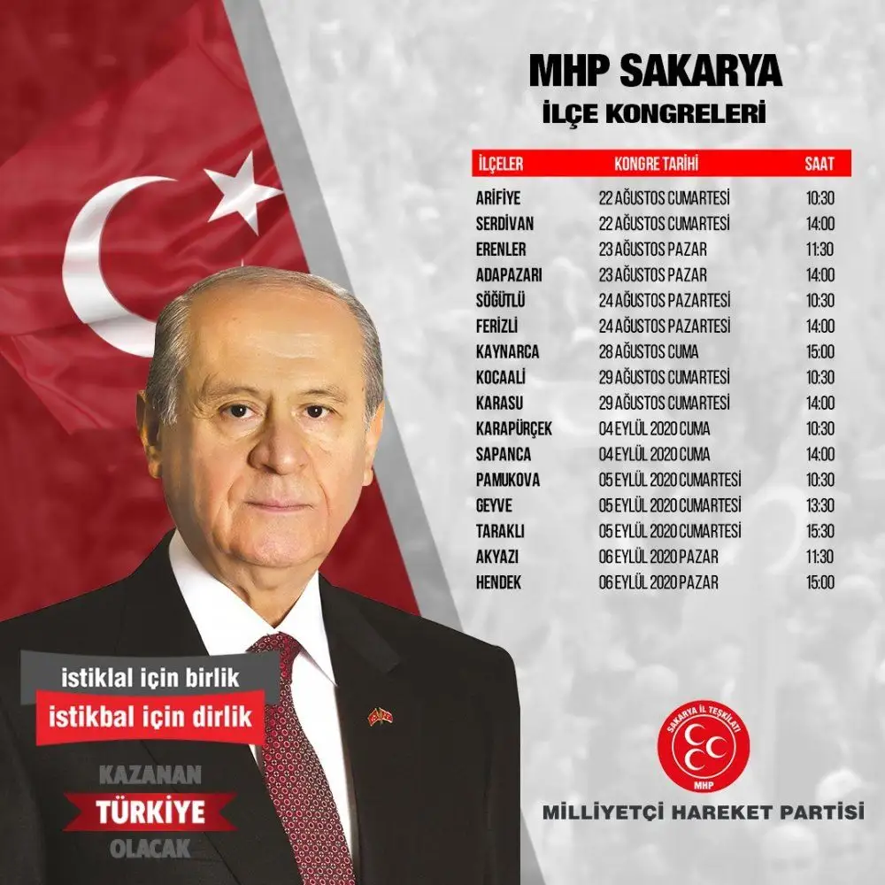 Milliyetçi Hareket Partisi (MHP) Sakarya İlçe Kongreleri 22 Ağustos ile 6 Eylül tarihleri arasında gerçekleşecek.