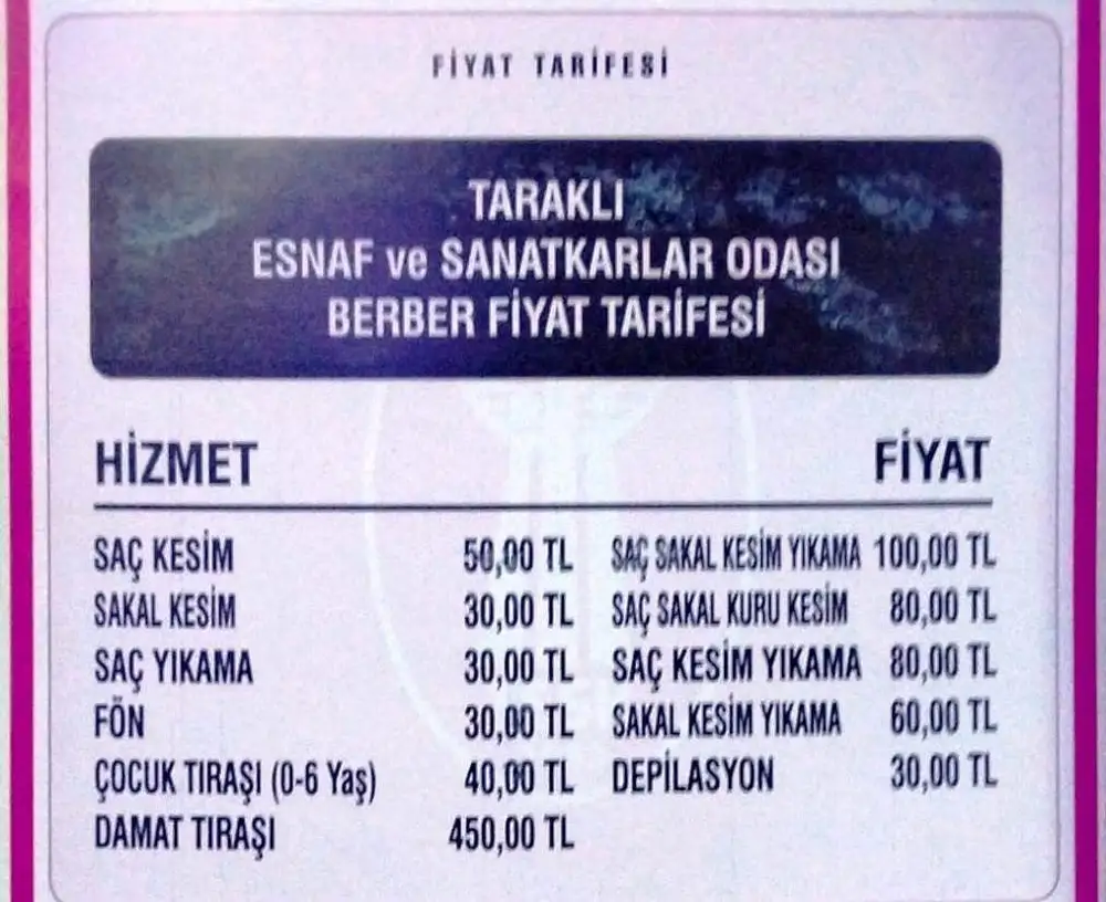Taraklı Esnaf ve Sanatkarlar Odası’nın açıkladığı yeni tarifeye göre;
