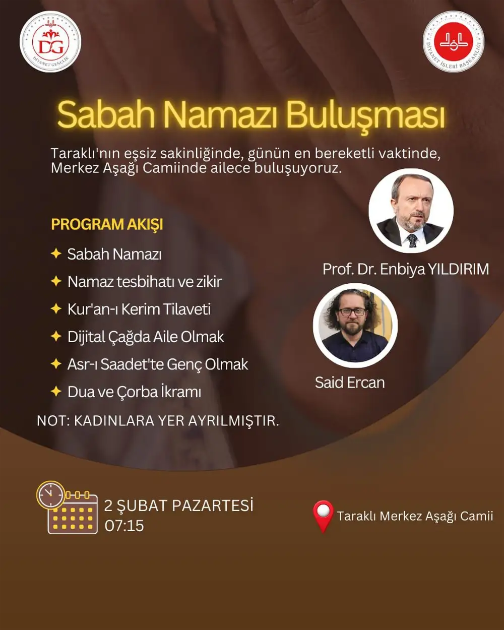 Programın konukları arasında Prof. Dr. Enbiya Yıldırım ile Araştırmacı-Yazar Said Ercan yer alacak. Konuklar, “Dijital Çağda Aile Olmak” ve “Asr-ı Saadet’te Genç Olmak” başlıkları altında katılımcılarla sohbet edecek.
